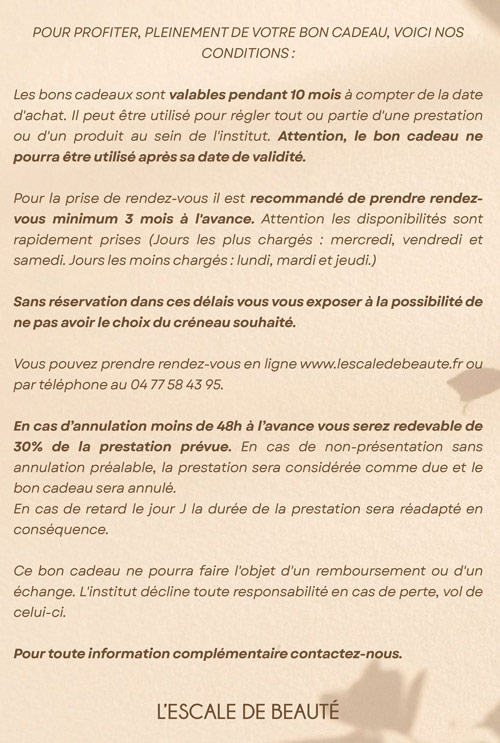- Le bon cadeau d'une valeur peut être consommé en prestations ou en achats de produits
